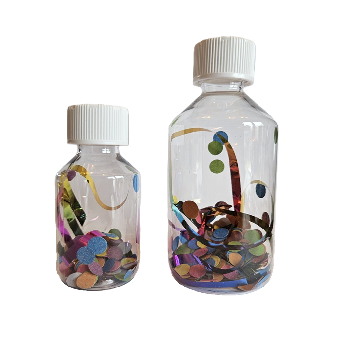 Dit speelflesje is samengesteld voor het thema feest en carnaval. Gevuld met met vrolijke confetti en serpentines die uitnodigen tot kijken, schudden en ontdekken. Ze sluiten aan bij allerlei feestmomenten, van carnaval tot vrolijke kinderfeestjes.